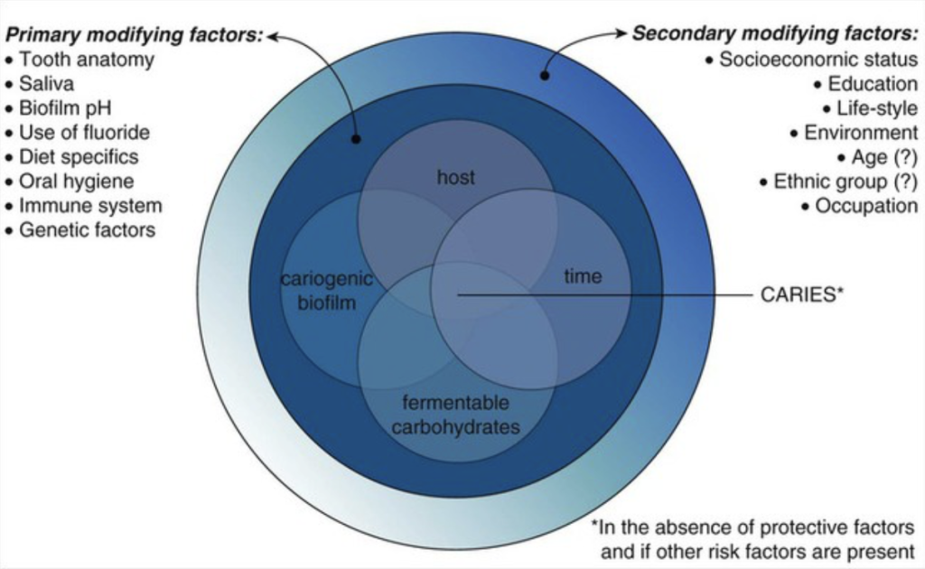 Elles sont causées par un dérèglement de la flore orale, qui peut aussi être appelée le biofilm. Ce dérèglement est causé par la présence de carbohydrates fermentables par les bactéries en bouche. Il va provoquer une déminéralisation de l’émail et la dentine de la dent, puis une perte de ces structures.
